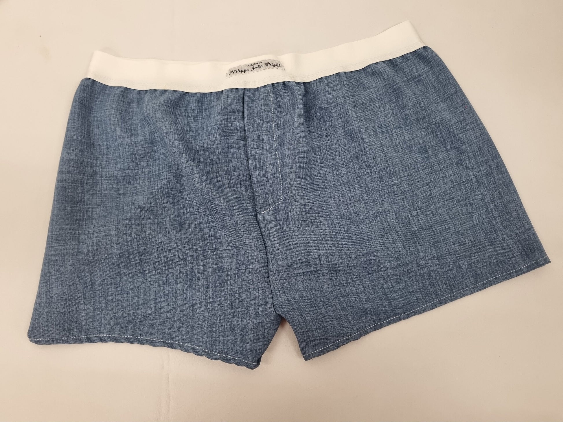 Blue LINEN men boxer shorts with white elastic.